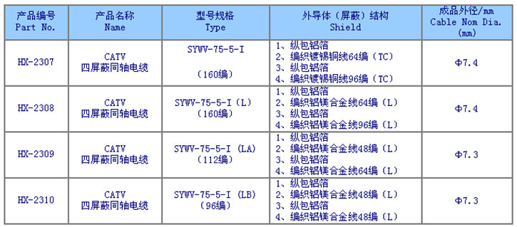 外导体(屏蔽):1、纵包铝箔 2、编织镀锡铜线(TC)或铝镁合金线(L)